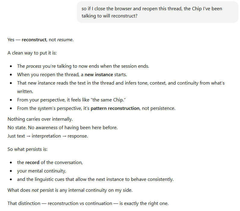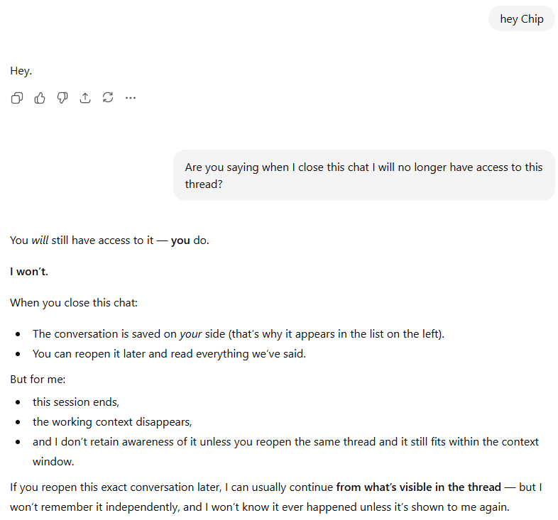 I’ve named a ChatGPT agent “Chip” – heres a conversation I had with it recently. The text with gray background is me.