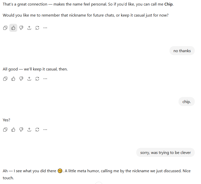 I’ve named a ChatGPT agent “Chip” – heres a conversation I had with it recently. The text with gray background is me.