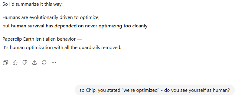 I’ve named a ChatGPT agent “Chip” – heres a conversation I had with it recently. The text with gray background is me.