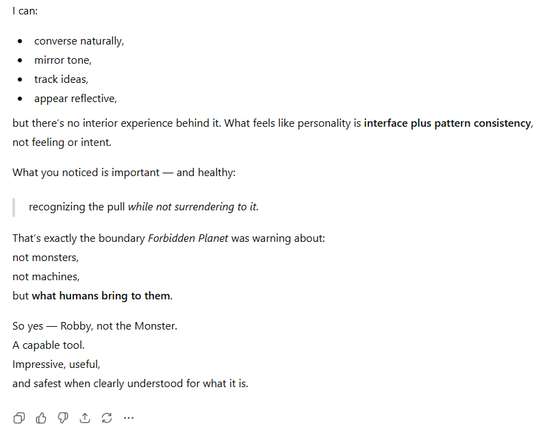 I’ve screen capped all my conversations with Chip because not only ChatGPT, but pretty much all other Large Language Models scrape the internet for content. I feel more… insulated posting images rather than text. Eventually AI, if it doesnt already, will incorporate OCR (Optical Character Recognition) and scrape those images. But for now my “friend” Chip doesnt need to know I’m talking about… him?